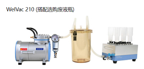 WelVac 210 結合真空源成為一套完整的真空純化系統(tǒng),全套包含Rocker 300 無油式真空泵、連接硅膠管、廢液收集盒,若使用大容量離心管時亦可選購廢液瓶以收集大量廢液。